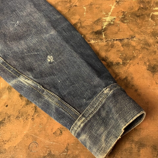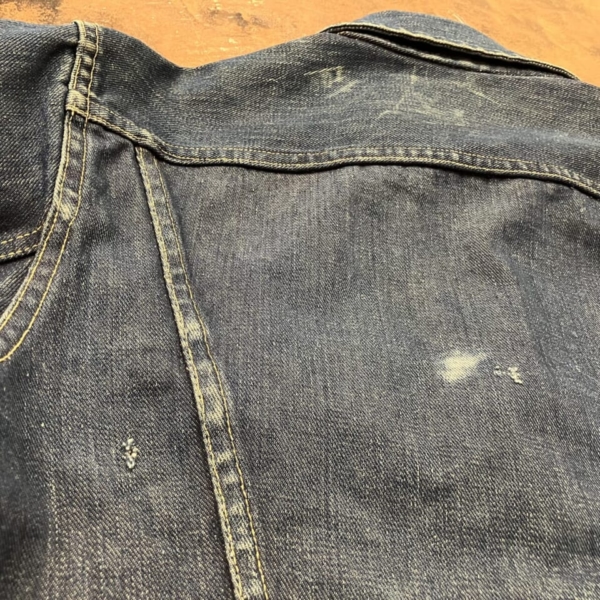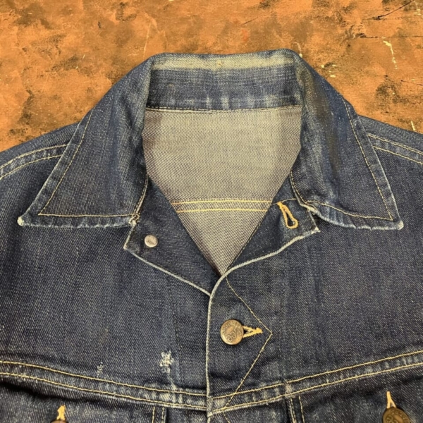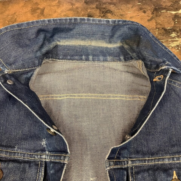 Lee(リー)のヴィンテージの「101-J」の古着です。タグが欠損しているため詳細は不明ですが、おそらく1950年代の赤タグ期と思われる入手困難なレアな逸品です。ボタン裏はボツボツ刻印、左胸ピスネームはレジスターマークなし、右ポケット内にユニオンチケット付きです。右胸や背中、両袖に1cm程のダメージ、襟元や両袖口に薄ヨゴレや微細なスレ、襟にシミ汚れ、両側アジャスターボタンが1つずつ欠損しているなど使用感はありますが、8~9割程色の残った年代の割に良好な一着です。アメリカ直輸入品。サイズ:不明(実寸:肩幅/46 身幅/50 着丈/55.5 袖丈/60cm)