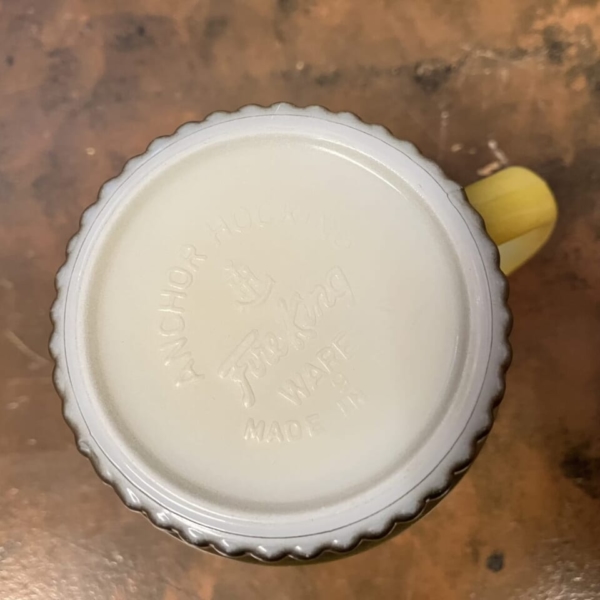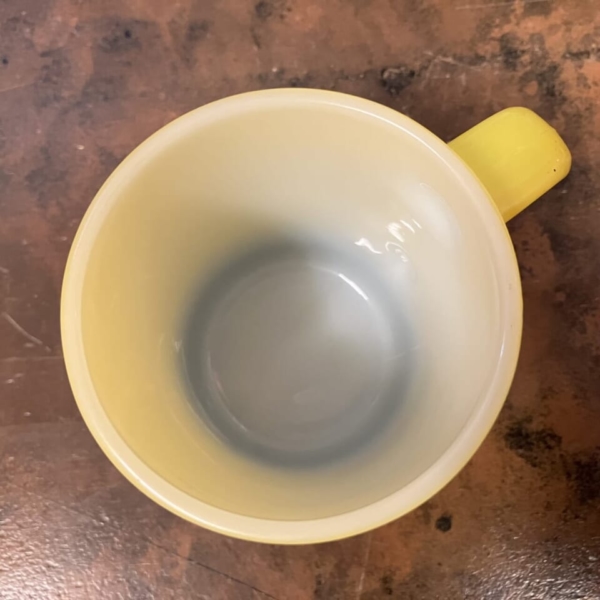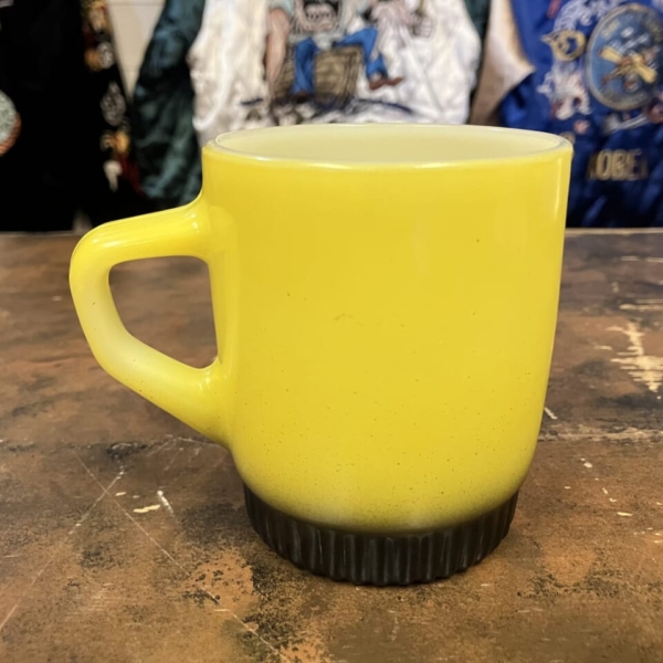 商品 » 商品ジャンル » ファイヤーキング他 » カラー » Fire-King(ファイヤーキング)リブボトム 黄・黒 Fire-King(ファイヤーキング)リブボトム 黄・黒 品番:fkcl056 1点在庫有り ¥4,730 Fire-King(ファイヤーキング)の青・黒のリブボトム・マグです。ハンドルが太く、あばら骨のようなうねったデザイン(RIBBED)のボトムが特徴のマグです。ボトム部分に黒もしくは茶色でカラーを吹き付けされたシリーズで、独特のワン・アクセントが効いています。ワレ、カケなくツヤがあり、殆ど使用感の無いニアミント・コンディションです。アメリカ直輸入品。(サイズ:H8.8×W10.5×φ7.7)