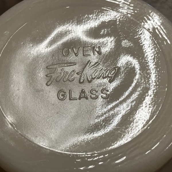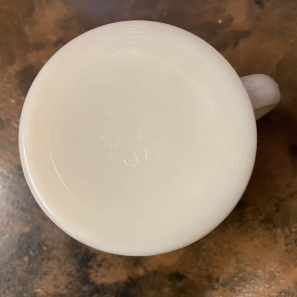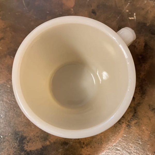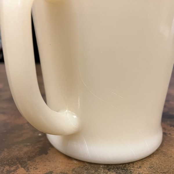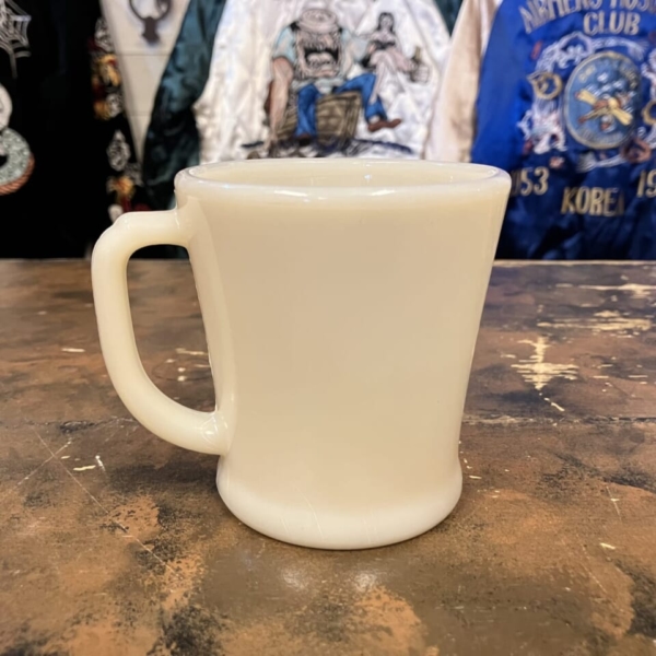 Fire-King(ファイヤーキング)のアイボリーカラーの「GLASS」刻印のシェービング・マグです。1940~50年代初期の別名フラットボトムと呼ばれている物で、通常のDハンドルと比べ底が平らな形状をした初期型のDハンドル・マグです。その中でも「GLASS」刻印(2番目に古い刻印)は初期の頃にしか見られない、とてもレアな逸品です。ハンドル付近に製造上のヘアラインは見られますが、ワレ、カケ無くツヤがあり使用感の無いニアミント・コンディションです。アメリカ直輸入品。(サイズ:H8.7×W10.5×φ8.4cm)