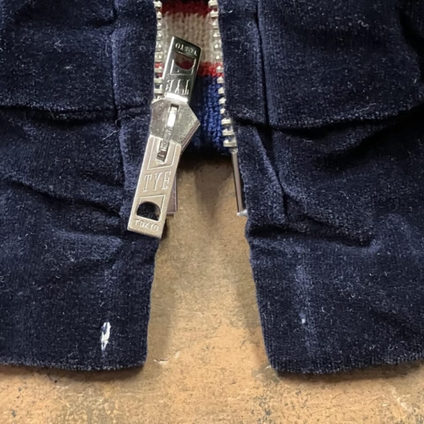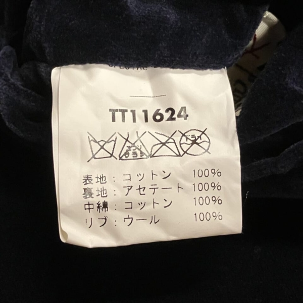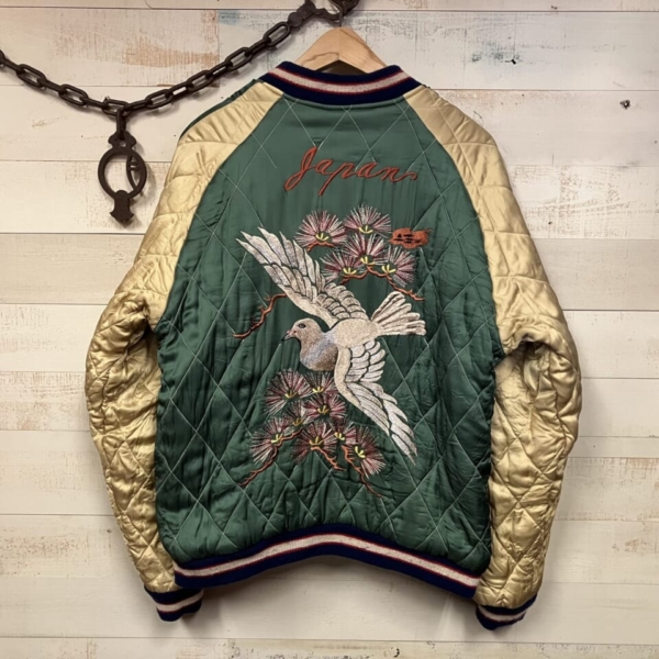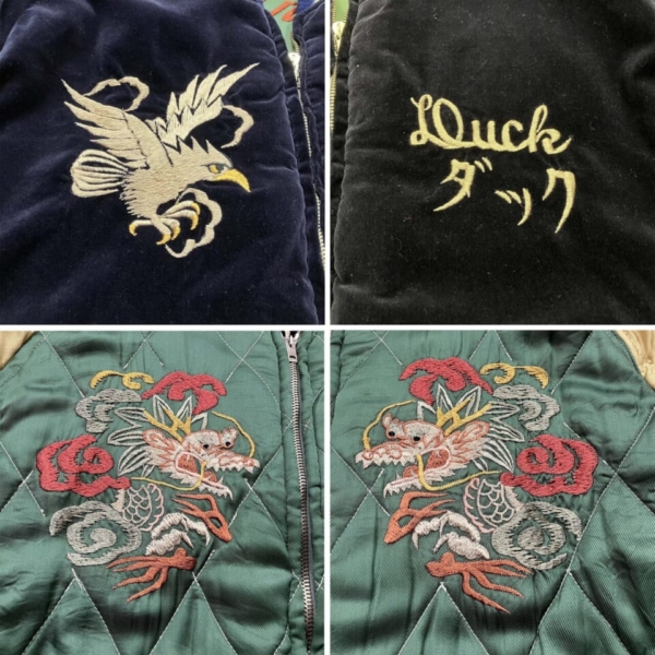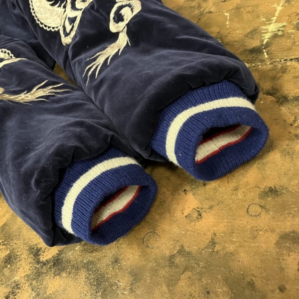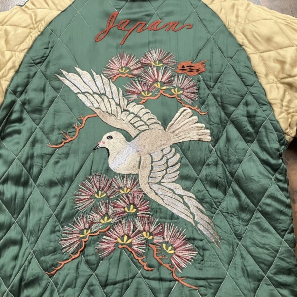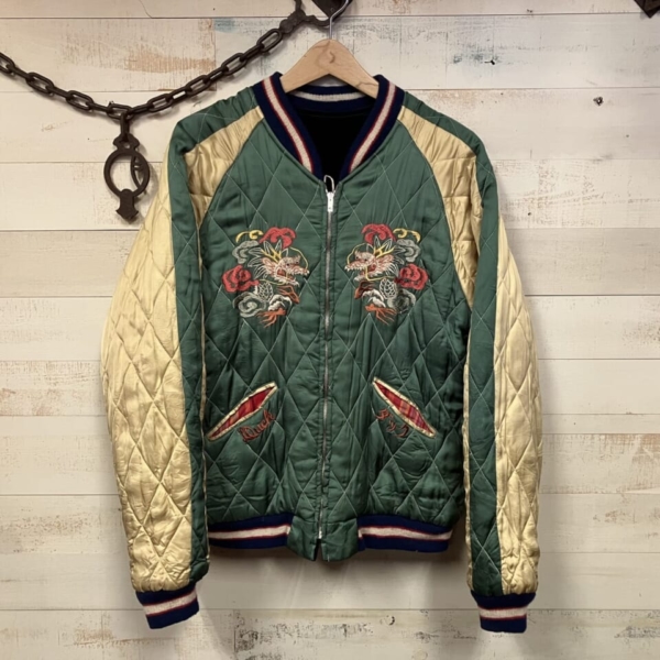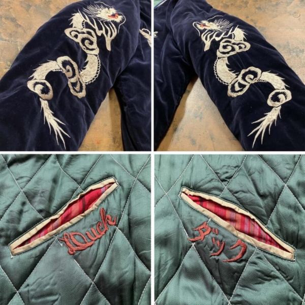 テーラー東洋のスペシャル・エディションの別珍スーベニアジャケット「YOKOTA AIR BASE JAPAN」です。東洋エンタープライズ社の前身「港商」が1950年代初期に製作したスーベニアジャケットを素材・縫製・ファスナーなど当時そのままに再現した2008年の限定品で、今では入手困難なレアな逸品です。表の別珍側の両袖には「龍」、右胸には「鷲」、左胸には「ダック」、背中には横田基地に展開する「第3航空師団」のスコードロンが、裏のサテンキルト側の両胸には「龍」、両ポケットの縁に「ダック」、背中には「鳩」が刺繍されていています。リブに多少の毛玉など使用感は見られますが、目立つヨゴレやダメージの無い良好な一着です。サイズ:大(身幅/60 着丈/61 裄丈/87cm)