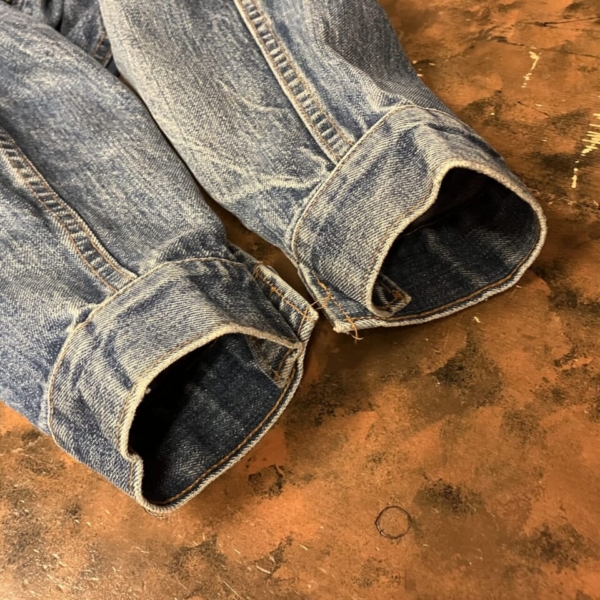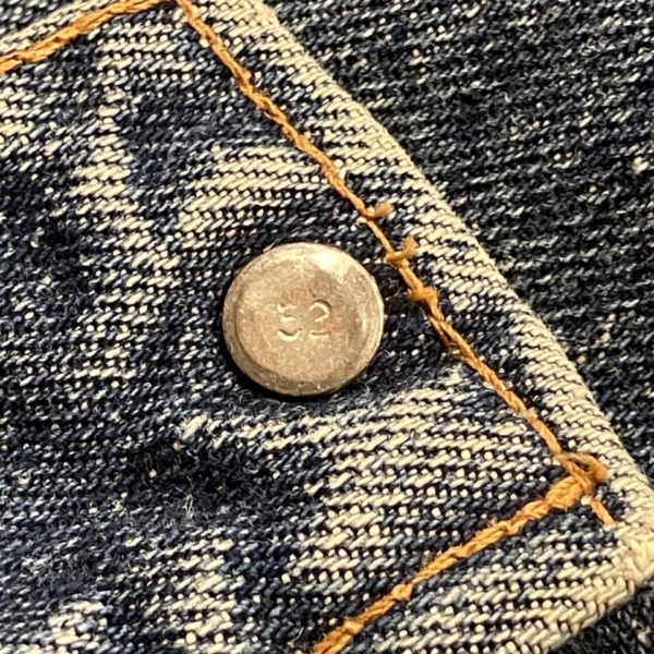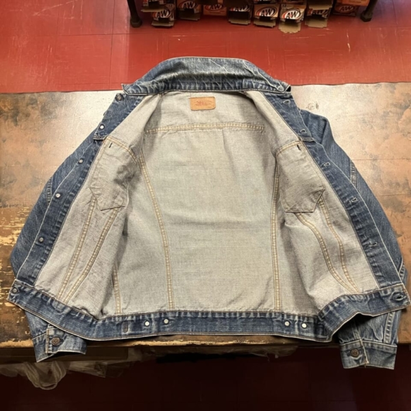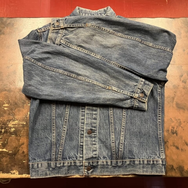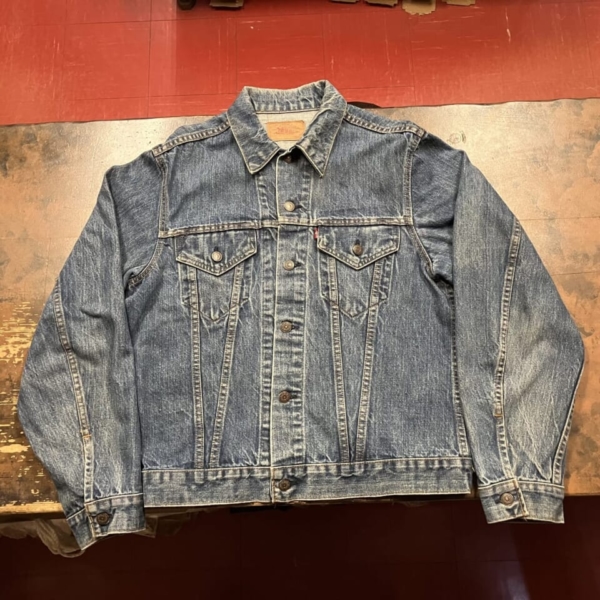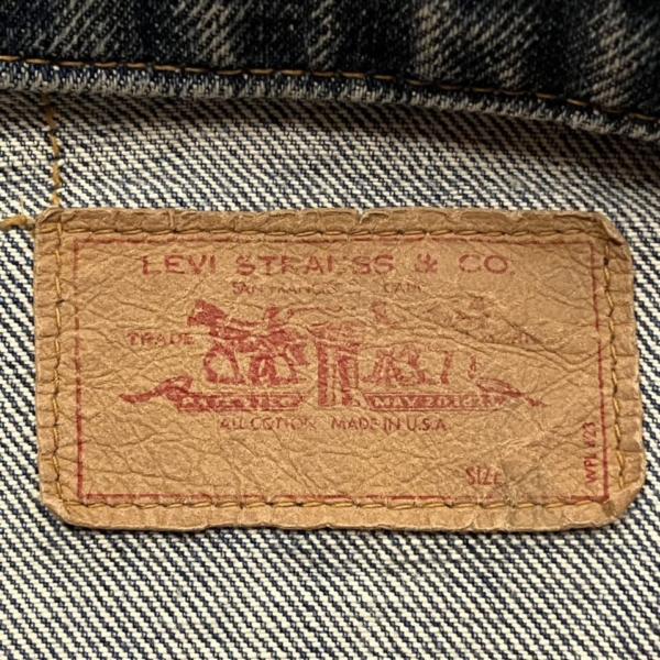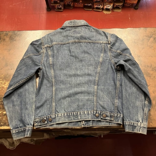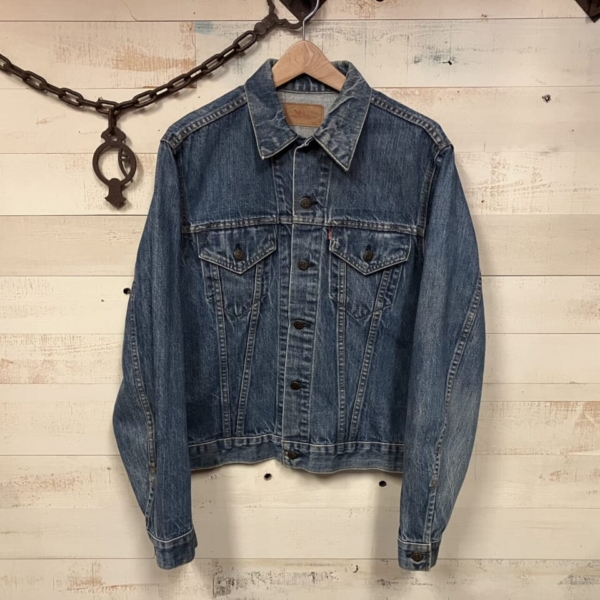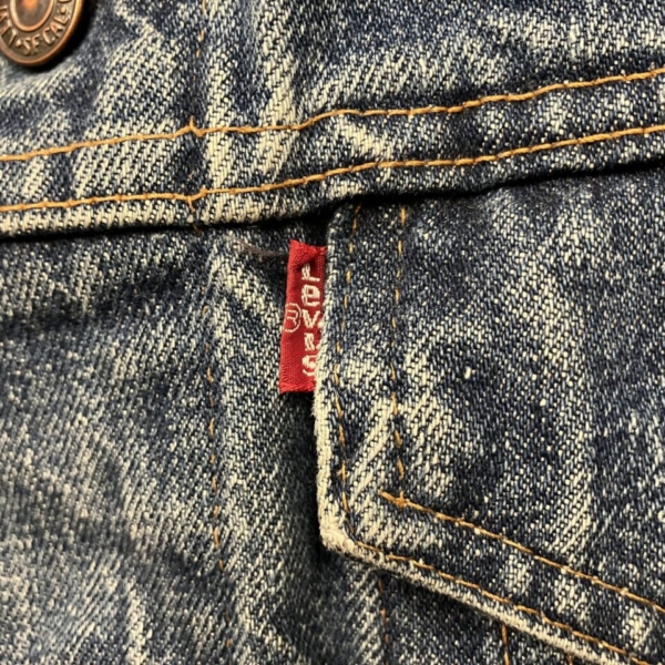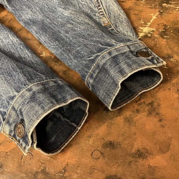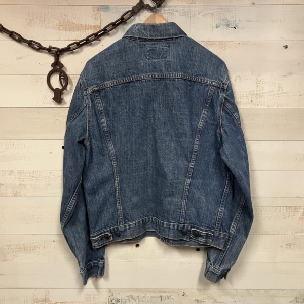 LEVI’S(リーバイス)のヴィンテージのGジャン「70505-0217 スモール e」の古着です。ケアタグは付いていませんが、おそらく1970年代のケアタグが布から紙に変更されたモデルで、ステッチに綿糸では無く合成繊維が使われています。ボタン裏は「52」刻印、タブはレジスターマーク入り両面「スモール e」です。全体的に色褪せなど古着特有の使用感はありますが、目立つヨゴレやダメージの無い良好な逸品です。アメリカ直輸入品。サイズ:不明 L位(実寸:肩幅/48 身幅/55.5 着丈/60 袖丈/65cm)